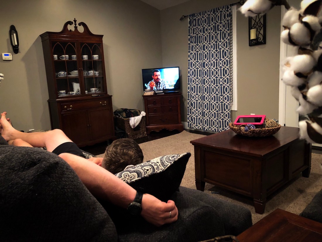 When I walked in the house, he was snuggled up in the double chair with our youngest. He was fast asleep. I walked upstairs to put my things away and came back. I leaned over the chair thinking of how much I missed him so I could give him a kiss on the cheek.